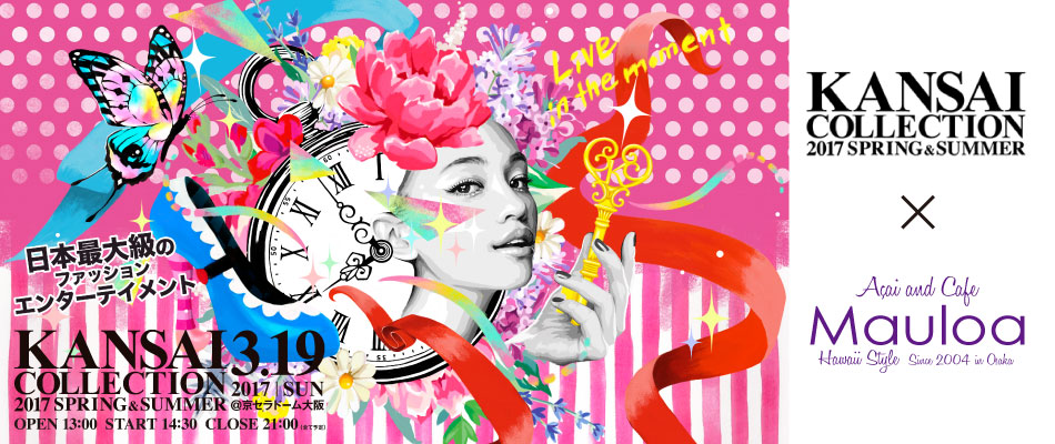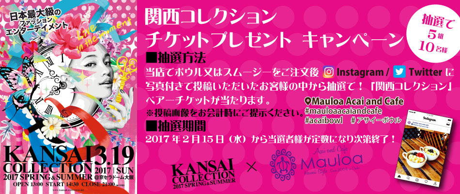 ご来店時にボウル又はスムージーをご注文後「Instagtam」「Twitter」に写真付きで投稿いただいたお客様の中から抽選で5組10名様に「関西コレクション」ペアーチケットが当たります!(^^)!